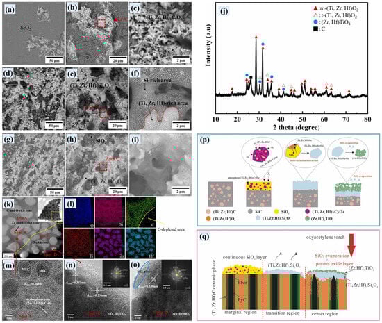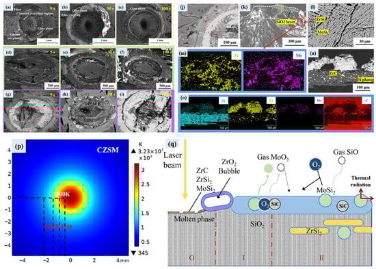 Ablation morphologies, microstructure, temperature distribution, and ablation mechanisms of the ablated composites: (a–c) 5, 30, and 100 s for CS; (d–f) 5, 30, and 100 s for CZS; (g–i) 5, 30, and 100 s for CZSM; (j) surface and regions of the ablated CZSM, (k) cross-sectional view of area A, (l) large view of area A, (m) element mapping of area A, (n) molten pool morphology, and (o) element mapping of the molten pool; (p) temperature distribution of CZSM during ablation for 100 s; and (q) ablation mechanisms of the CZSM composites. Copied with permission from Elsevier [113].