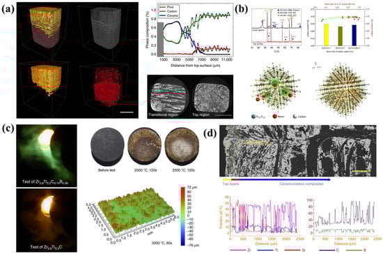 - Gao, S.; Wang, Y.; Hu, J.; Zeng, Y.; Xiong, X. Ablation behaviour of multi-component (Hf, Zr, Ti)C ceramics modified carbon/carbon composites. J. Eur. Ceram. Soc. 2025, 45, 117141. [Google Scholar] [CrossRef]
