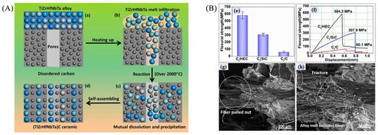 (a) Schematic diagram of reactive melting infiltration and (b,c) microstructure of C/C-SiC-(ZrxHf1−x)C composites prepared via RMI process. Copied with permission from American Chemical Society and Elsevier [26,33].
