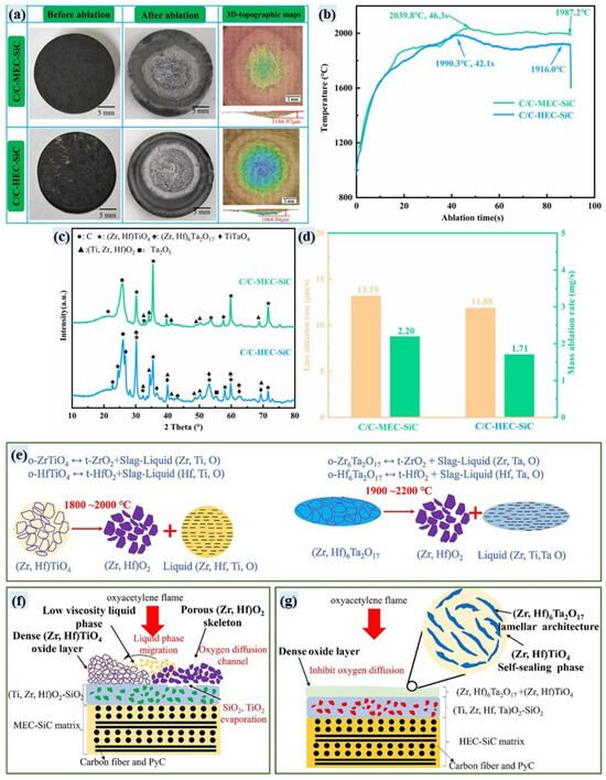 - Zhang, X.; Luo, X.; Liu, Z.; Zuo, Y.; Yang, X.; Huang, Q. Effect of (Ti, Zr, Hf)C medium-entropy and (Ti, Zr, Hf, Ta)C high-entropy modification on microstructure and ablative properties of C/C-SiC composites. Mater. Charact. 2025, 223, 114952. [Google Scholar] [CrossRef]