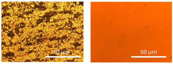 Optical micrographs were obtained using 5× and 10× objective lenses. Figure 3 presents the optical micrographs of sample 1 (coded as 0,0,0,0; decoded: 42.9 g·L−1, 500 °C, 1.5 A·cm−2, 20 min) and sample 20 (coded as 0,0,2,0; decoded: 42.9 g·L−1, 500 °C, 3 A·cm−2, 20 min), allowing for the analysis of the influence of current density while keeping concentration, temperature, and residence time in the custom-designed electrolytic cell constant.