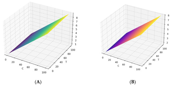 (A) Regression curve: R versus C and T (DC = 1) and (B) regression curve: S versus C and T (DC = 1, t = 50).