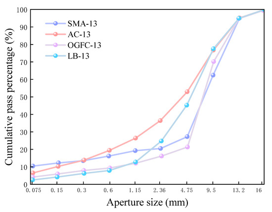 CPAM is in need of a dense skeleton structure to meet the requirements of high-temperature stability after early traffic and secondary compaction. It is necessary to retain a certain void ratio (greater than 3–5% of the SMA) at the initial stage, so as to facilitate the evaporation of diluent. In the process of utilization, CPAM gradually becomes more dense, the void ratio decreases, the evaporation of diluent also slows down, and stabilized strength emerges. Therefore, the specification (JTG F40-2004) [17] proposed a special LB gradation for both the skeleton compact structure and void ratio of CPAM. The test shows that its early compaction void ratio is about 8–11%. In this paper, with reference to the specification LB-13 gradation and previous research [1], a synthetic gradation is designed, as shown in Figure 1.