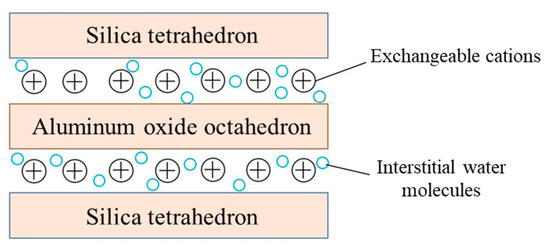 Bentonite is a mineral containing 85–90% montmorillonite, renowned for its exceptional water absorption capacity. Upon water contact, bentonite could expand 20 to 30 times in volume into a paste state. Montmorillonite ((Na, Ca)0.33(Al, Mg)2[Si4O10](OH)2·nH2O) features a sandwich-like layered structure: two silica tetrahedral sheets enclosing an alumina octahedral sheet. A weak interlayer bonding force allows cations within its crystalline structure to be readily exchanged with others, resulting in high ion-exchange capacity and significant water absorption swelling, and the structural model is shown in Figure 2 [9].