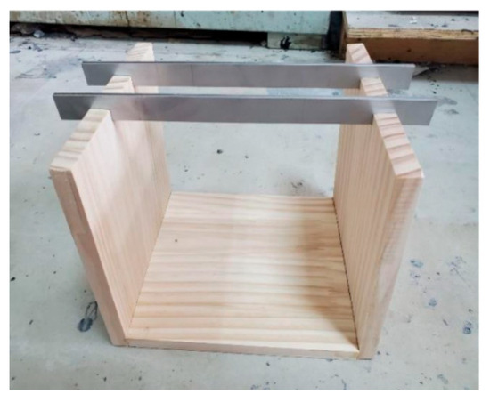 (2) Then, a U-shaped frame composed of three 200 mm × 200 mm wooden boards was prepared, where both sides of the frame had slots for placing the blade boards, with a distance of 50 mm between the blade boards; the instrument is shown in Figure 4.