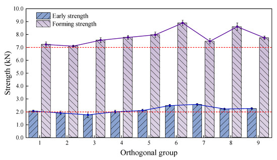 This indicates that when the total filler amount is the same, the ratio of bentonite and cement replacing mineral powder at 30% and a bentonite/cement ratio of 0.2:1 could achieve higher strength, which was group 8. Meanwhile, group 9 used a ratio of 50% bentonite and cement replacing mineral powder and a bentonite/cement ratio of 1:1, which did not reach the highest strength. This also proves that it is not necessarily true that a higher content of cement and bentonite is better; excessive cement or bentonite may reduce the cohesion of the asphalt binder, and thus, the strength of the CPAM would decrease. Considering all factors, group 6 had the highest initial and forming strengths, followed by groups 8, 5, and 1 with better strength.