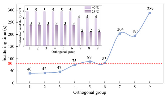 Based on the construction workability and scattering time, the lowest filler amount of groups 1, 2, 3 had the shortest scattering time of only 40 s, 42 s, and 47 s, which were far better than the stipulated scattering time of less than 80 s. Groups 4, 5, and 6 had 4.3% moderate, and the scattering time was approximately 80 s, which barely met the requirements. While when the filler amount reached 6.3%, the scattering time of groups 7, 8, and 9 increased sharply, reaching 204 s, 195 s, and 289 s. The low-temperature construction workability grades of these three groups were only grade 2, which did not meet the basic requirements for low-temperature construction. The construction workability at room temperature grade was only grade 4, which did not meet the requirements of grade 5. This indicates that the more filler used, the longer the scattering time, and the worse the workability. Among all groups, group 9 had the longest scattering time and the worst workability. The reason might be that the proportion of bentonite and cement replacing the mineral powder in group 9 was the largest, and the amount of bentonite was the most. Therefore, it is concluded that when the total filler amount is the same, the larger the proportion of bentonite and cement replacing the mineral powder, the worse the workability will be.