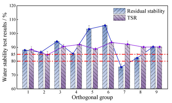 The analysis of the immersion Marshall test and freeze–thaw splitting test results is shown in Figure 7.