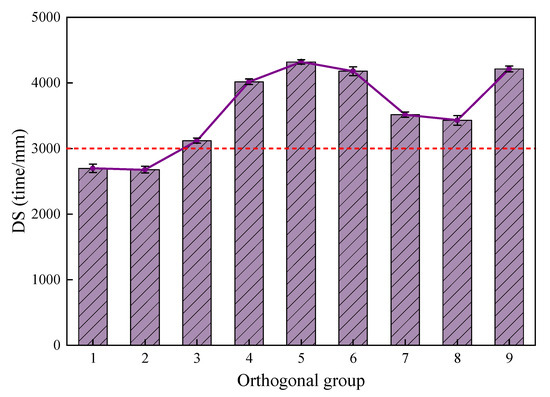 The ANOVA indicates that only the total amount of filler had a significant impact on the dynamic stability; factors B and C had no significant effect. From Figure 8, it is intuitively seen that the filler amounts in CPAM corresponding to the groups 1, 2, and 3 were the lowest, and the dynamic stability was relatively low. The reason is that less filler and more free asphalt in the mixture would result in a lubricating effect between the mixtures, which makes the surface of the mixture more prone to rutting, and the dynamic stability decreases. When the filler amount was increased to 4.3% and 6.3%, no significant improvement in dynamic stability was observed, and the peak value was concentrated in groups 4, 5, and 6 with a moderate filler amount. This indicates that it is not the case that the higher the filler amount, the better the high-temperature performance of the CPAM. Group 9, with a higher proportion of bentonite and cement, showed a significant improvement in high-temperature performance, indicating that bentonite and cement can conspicuously improve the high-temperature performance of the CPAM. Considering all factors, groups 5, 9, 6, and 4 had the best high-temperature performance.