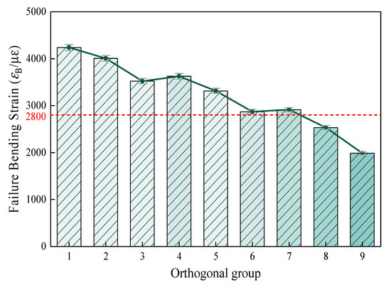 The results of the ANOVA indicate that the total amount of filler and the proportion of cement and bentonite replacing the mineral powder had extremely significant effects on the low-temperature cracking resistance of CPAM. As can be seen from Figure 9, with the increase in filler dosage, the failure bending strain decreased significantly. When the filler amount is the same, a higher the proportion of cement and bentonite replacement can be, and a lower failure bending strain of CPAM can be achieved. This change trend can clearly be observed from the test results of groups 1 to 9. Most groups met the requirement of failure bending strain. When the filler amount reached 6.3%, the failure bending strain of each group significantly decreased, which in group 9 was only 1984 ꜪB/μꜪ, with the most significant decrease. Although the low-temperature failure bending strain of group 6 also decreased, it still met the requirement of ≥2800 ꜪB/μꜪ specified in the standard.