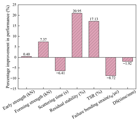 On this basis, the performance of the conventional group and group 6 were compared. The total amount of filler in the conventional group is 4.3%, and the filler is 100% lime powder. Table 14 shows the performance comparison between group 6 and the conventional group. The percentages of improvement in each performance are shown in Figure 10.