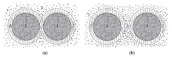 The asphalt film in CPAM. (a) Structure asphalt connection. (b) Free asphalt connection. Note: 1 represents aggregates; 2 represents structural asphalt; 3 represents free asphalt.