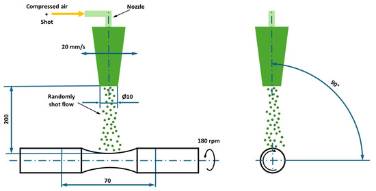 Schematic illustration of the shot peening process performed on hourglass fatigue test bars [29].