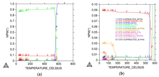 (a) Equilibrium phase constituents predicted by Thermo-Calc software for the designed Alloy A chemistry; (b) detail of (a).