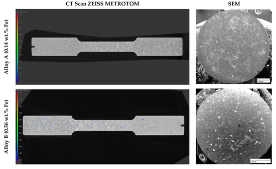 Specimens for microstructural analysis were prepared from test bars according to ASTM E3 metallographic testing standards [32] used for aluminium alloys. The microstructure was revealed on polished cross-sections etched with 0.5% HF (CentralChem, Bratislava, Slovakia). The microstructure was analysed using an optical microscope, NEOPHOT 32 (Carl Zeiss Jena GmbH, Jena, Germany), with NIS Elements software, version 4.20 (Nikon Corporation, Tokyo, Japan), covering quantitative measurements of casting defects. Thermo-Calc software (Thermo-Calc Software AB, Stockholm, Sweden) and the COST2 database (Thermo-Calc Software AB, Stockholm, Sweden) were used to conduct thermodynamic calculations to investigate the phase evolution. The phase equilibria of the system were calculated within the temperature range of 0–600 °C. The calculation considered elements P, N, Cu, Mg, Mn, Zn, Si, and Fe and the presence of different phases, including liquid, β-AlFeSi (monoclinic), eutectic Si (cubic diamond-A4), Laves phase MgZn2 (hexagonal), α-Al (matrix FCC-A1), Mg2Si (cubic), α-AlMnSi (cubic), Mg2Zn11 (cubic), Zn (hexagonal), θ-Al2Cu (tetragonal), Al6Mn (orthorhombic), and α-AlFeSi (cubic). Porosity was examined with a CT scanner ZEISS METROTOM (Carl Zeiss Industrielle Messtechnik GmbH, Oberkochen, Germany), and microfractographic examination was done using SEM TESCAN VEGA LMU II (TESCAN ORSAY HOLDING, a.s., Brno, Czech Republic).