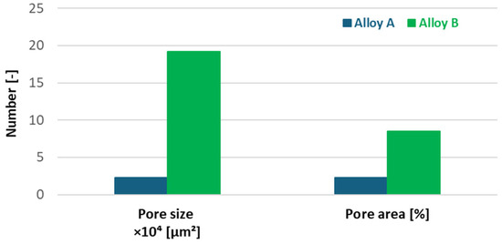 Increasing iron content in the experimental alloys significantly enhances porosity. Alloy B exhibited larger, more widely distributed pores than Alloy A, increasing total pore area from 2.26% to 8.5% (Figure 6; Figure 7). Porosity, particularly when irregular in shape or located near hard phases, amplifies stress concentrations. As shown in prior work [38], such shrinkage porosity acts as a dominant fatigue crack nucleation site in cast aluminium alloys.