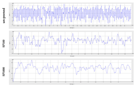 Surface roughness profiles of un-peened samples and samples after shot peening, varying by coverage levels (λc = 2500 μm).