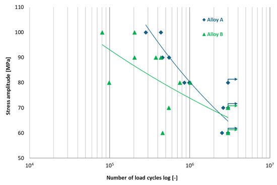The high-cycle fatigue strength results for Alloys A and B were previously published in [15] research, with the test results illustrated in Figure 10. An S-N curve was constructed, indicating the fatigue limit for Alloy A at = 65 MPa and for Alloy B at = 66 MPa. Markers with arrows indicate specimens that did not fail before reaching the cycle limit (run-out). Despite a higher percentage of Fe, the results indicated that specimens exhibited extended fatigue life, despite elevated iron content. Building on this research, samples of Alloys A and B were shot peened at different coverage levels and underwent high-cycle fatigue testing under the same conditions as in the [15] study.