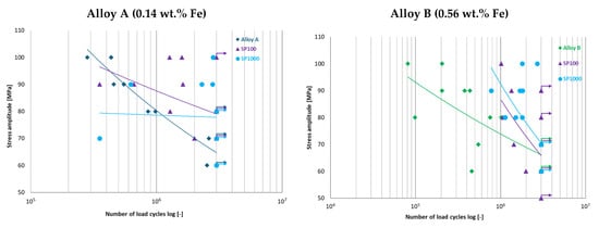 Effect of different Fe content on fatigue lifetime in secondary aluminium Alloys A and B for load/stress ratio R = −1 [15].
