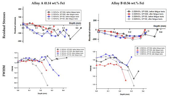 Given the interplay between residual stress and fatigue behaviour, the distribution of residual stress in the experimental alloys was measured. Figure 12 presents residual stress assessment results in secondary aluminium Alloys A and B after shot peening for both SP100 and SP1000 treatments. The beneficial effects of shot peening are primarily attributed to compressive residual stresses and pore closure. Compressive surface stresses are known to suppress microcrack nucleation, and this effect was confirmed here. However, their effectiveness is limited by penetration depth (~0.4 mm), as also shown in residual stress profiles (Figure 12). These residual stresses do not significantly influence fatigue crack initiation in regions beyond this depth, where pores and Fe phases are more crucial. Increasing the peening coverage level from 100% to 1000% did not enhance the residual stress field; the stored energy, represented by the area under the Full Width at Half Maximum (FWHM) versus depth curves, remained nearly identical. The FWHM decreased with depth, indicating diminished work hardening and residual stress effects beyond 0.4 mm below the original surface. This suggests that the shot peening process had no significant impact beyond this depth.