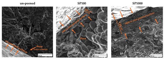 Fatigue cracks in un-peened Alloys A and B samples were primarily initiated from casting defects, such as pores or shrinkage cavities, as illustrated in Figure 13. These defects are typically located near or at the specimen’s free surface. The shot peening process effectively mitigated these issues by visibly reducing surface porosity, minimizing pore size, and decreasing their overall number. Surface pores were visually reduced by shot peening, as seen in Figure 13, supporting the conclusion that mechanical densification helps to eliminate critical crack initiation sites. While surface roughness increased post-peening, its negative impact was outweighed by the benefits of residual stress and porosity reduction, in agreement with observations from [27] on fretting fatigue. This improvement positively impacted the fatigue lifetime of the materials. The thickness of the shot peened layer varied with different levels of shot peening coverage. For SP100, the layer thickness averaged approximately 50 μm, whereas, for SP1000, it increased to about 130 μm. Despite these variations, fatigue cracks still initiated from the surface, albeit at significantly fewer locations due to the treatment.