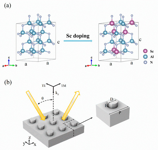 With varying Sc doping concentrations, the intrinsic infrared photon–phonon interactions in ScAlN change significantly and thus influence the electromagnetic interactions of light with ScAlN-based nanoresonators. The infrared dielectric functions of ScAlN thin films grown through molecular beam epitaxy were measured using spectroscopic ellipsometry [11] and chosen as the thermophysical input for finite element method (FEM) simulations of ScAlN-based nanoresonators. In Figure 1b, a schematic diagram of a representative ScAlN nanoresonator is presented, and its geometry is defined by the period (P), diameter (D) and height (H). A transverse magnetic (TM) wave was launched within the xz plane at an incident angle of 0° (normal incidence kz ) in the simulation. Floquet periodic boundary conditions were imposed in the X and Y directions for the FEM simulation to simulate the nanoresonator array structure, while perfectly matched layers with a thickness of a 1/3 of a wavelength were applied in the Z direction. The global convergence grid was set to 1/10 of a wavelength, and the grid of the nanoresonator was refined to 0.1 μm.