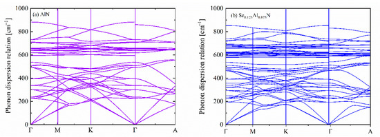 A comparison of the theoretically calculated phonon dispersion relation for (a) AlN and (b) Sc0.125Al0.875N from first-principles calculations. The high-symmetry-point coordinates are Γ (0,0,0), M (0.5,0,0), K (0.3333,0.3333,0) and A (0,0,0.5).