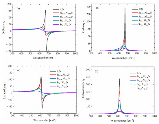 The infrared dielectric function arises from intrinsic photon–phonon interactions, and phonon modes altered by Sc doping influence the dielectric function further. In Figure 3, the anisotropic complex dielectric functions of ScAlN with varying Sc concentrations under ambient conditions are presented and extracted from Ref. [11]. Owing to its wurtzite lattice structure, the ordinary (⊥c) dielectric function of ScAlN is largely different from that in the extraordinary (∥c) direction. As the doped Sc concentration increases, it is observed that the complex dielectric function is significantly altered. For instance, the maximum of the ordinary ε2 (see Figure 3a) is greatly reduced at a Sc doping concentration up to 20%; the width is largely broadened; and the location of the absorption peak shifts to a lower photon energy.
