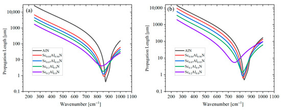 Moreover, for incident photons with frequencies lying between ωTO and ωLO , it is found that the real part ε1 of the dielectric function is negative. These incident photons will propagate along the surface of ScAlN instead of being transmitted into it and couple with the lattice vibrations, thus forming surface phonon polaritons (SPhPs) [31,32,33,34]. The spectral range lying between ωTO and ωLO is defined as the Reststrahlen band (RB), where the incident photons are highly reflected by the ScAlN’s surface. With an increasing Sc doping concentration, the RB’s width is reduced, indicating that fewer incident photons can excite SPhPs. The intrinsic propagation length of the SPhPs propagating along the ScAlN’s surface is defined as Λ = (2Im ksp)−1 [35,36], where ksp is a complex wave vector defined by ksp = ω/c(ε/(1 + ε))1/2. ε is the complex dielectric function, and this relation applies to the single air–ScAlN interface. Figure 4a shows the SPhP propagation length in the ordinary direction at varying Sc doping concentrations. The propagation length initially decreases with an increasing wavenumber, exhibits a dip near 850 cm−1 and then increases at higher wavenumbers. Below 800 cm−1, increasing the Sc doping concentration results in a reduced propagation length. A similar trend is observed for the extraordinary direction, as shown in Figure 4b, although the overall propagation lengths are shorter compared to those in the conventional case. Equally, for Sc0.1Al0.9N, the highest propagation length can reach over 1000 μm, closely related to the long lifetime of optical phonons.