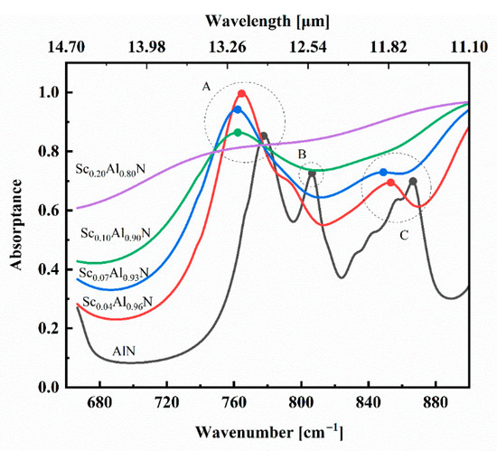 With such a large propagation length of the SPhPs in ScAlN, the introduction of nanostructuring onto the surface will induce localized surface phonon resonances and thus greatly modulate the optical properties. We calculated the absorption spectra of a ScxAl1-xN (x = 0, 0.04, 0.07, 0.10 and 0.20) nanoresonator with P = 7 μm, D = 3 μm and H = 1.5 μm. In Figure 5, it is obvious that pure AlN exhibits three absorption modes: mode A (777 cm−1), mode B (806 cm−1) and mode C (867 cm−1). By analyzing the electric field distribution further, we find that modes A and C are excited by the mirror-symmetric in-plane electric field, and mode B is the higher-order hybrid mode, as shown in Figure 6. However, resonance modes B and C gradually disappear with an increasing Sc doping concentration. For Sc0.04Al0.96N, only modes A and C are observed, while only one mode, mode A, remains when the Sc incorporation increases to 10%, and no mode is observed at 20% doping. Moreover, from Figure 5, it is obvious that upon Sc doping, the phonons in the AlN films are shifted to lower frequencies, and simultaneously, the peak widths increase drastically.