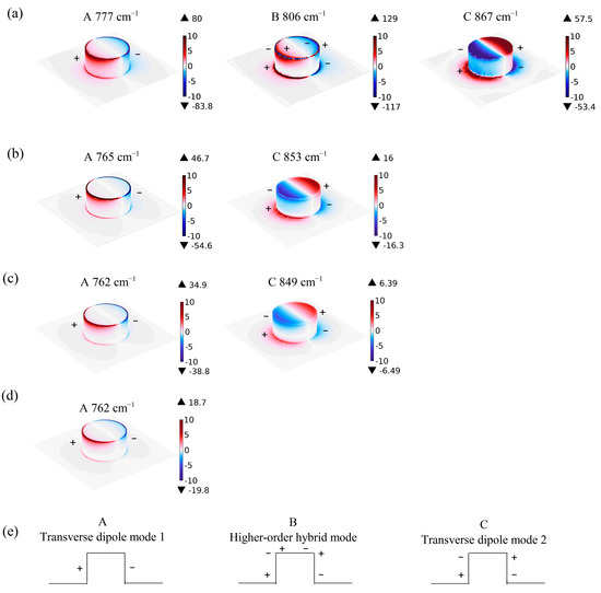 To display the relationship between the two absorption peaks (A and C in Figure 5) and the structural parameters intuitively, taking the Sc0.07Al0.93N nanoresonator as an example, the normalized |E|-field distributions of the two resonant wavenumbers (762 cm−1 and 849 cm−1) are calculated. From Figure 7a, it is observed that the |E|-field of absorption peak A (762 cm−1) is mainly concentrated around the nanoresonator, especially on the topside surface, while the second absorption peak C (849 cm−1) is mainly concentrated at the four corners of the nanoresonator. Additionally, peak C shows a much lower field intensity, indicating that the localization of this mode is relatively weak. And changes in the diameter and height of the ScAlN nanoresonator will affect the absorption spectra.