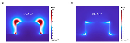 The normalized |E|-field distributions for the two absorption peaks at (a) A 762 cm−1 and (b) C 849 cm−1.