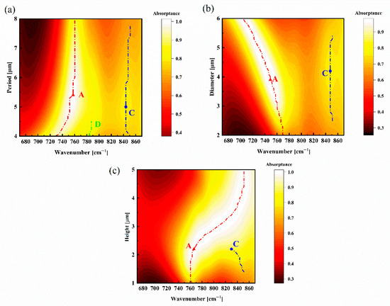 Furthermore, we studied the absorption characteristics of a Sc0.07Al0.93N nanoresonator with varying geometrical parameters (4 μm ≤ P ≤ 8 μm, 2 μm ≤ D ≤ 6 μm and 1 μm ≤ H ≤ 5 μm). Figure 8a shows the absorption spectra pertinent to different periods P with D = 3 μm and h = 1.5 μm. The position of mode A (TD1)’s absorption peak blueshifts almost linearly (Δk ≈ 20 cm−1/ΔP = 0.6 μm) as P increases. But almost no change is observed for the two modes when P ≥ 6.0 μm. It is obvious that a new mode D (TD1) appears at k ≈ 785 cm−1 and is coupled with mode A (TD1) when P = 4.6 μm, which leads to greater spreading of mode A. However, after this point, the peak widths decrease drastically with increasing period. Figure 8b,c display the absorption spectra as the diameter varies with P = 7 μm and H = 1.5 μm and the height with P = 7 μm and D = 3 μm varies. Mode A exhibits an obvious redshift and blueshift with an increasing height and diameter, especially for height; when H = 1.4 μm, mode C appears and is coupled with mode A at H = 2.2 μm, while the position of mode C’s absorption peak shifts slightly with an increasing diameter. As the diameter increases, the peak widths of the two modes decrease gradually but increase drastically with increasing height. These correspond to the field distribution analysis in Figure 7.
