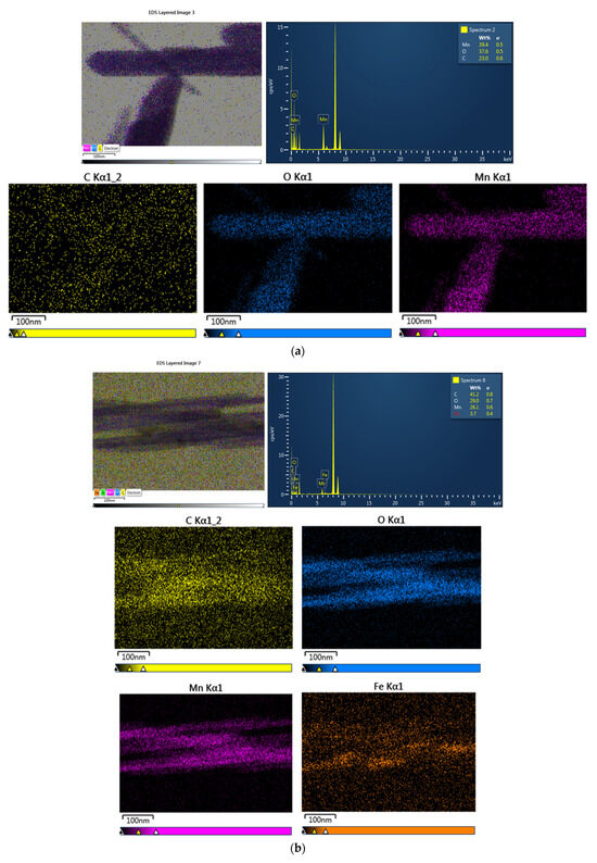 Figure 3a,b presents the EDS measurement results along with elemental distribution maps for the synthesized samples. Elemental analysis by EDX in the highlighted regions confirms the presence of all constituent phases. A uniform elemental distribution is observed across the selected surface of the examined particles. Carbon is detected as well, primarily originating from the carbon layer within the network and partially from the medium used to disperse the materials prior to analysis.