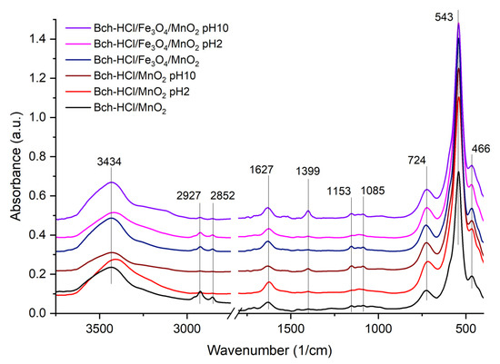 By analyzing the infrared spectra (Figure 5) of the Bch-HCl/MnO2 and Bch-HCl/Fe3O4/MnO2 samples, the following spectral bands can be identified: the band at 3434 cm−1 can be associated with the stretching vibration of –OH groups, linked through hydrogen bonds, originating from water adsorbed on the surface of the analyzed material; vibrational bands appear at 2924 and 2854 cm−1 due to the symmetric and asymmetric stretching vibrations of C–H bonds in CH2 and CH3 groups [37].
