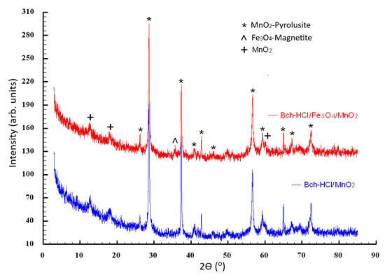 These are structurally similar, being characterized by the same diffraction maxima. Thus, two distinct phases of manganese oxide were identified. The first phase, the dominant one, is represented by the tetragonal lattice of manganese dioxide in the form of MnO2-Pyrolusite with lattice constants a = 4.38 Å, c = 2.85 Å, space group P42/mmm, which is characterized by a series of peaks appearing at 2θ = 28.7°, 37.3°, 40.8°, 42.7°, 46.2°, 56.6°, 59.3°, 64.8°, 67.2°, and 72.3°. The two diffraction peaks that appear at smaller diffraction angles 2θ = 12.7° 18.1° and the peak at 60.1° also correspond to manganese oxide MnO2, but are found in a polymorphic form, which is also tetragonal but characterized by higher lattice constants, with lattice parameters a = 9.78 Å, c = 2.86 Å, space group I4/m. Additionally, in the case of the Bch-HCl/Fe3O4/MnO2 sample, the presence of iron oxide in the form of magnetite, Fe3O4, is observed, which is manifested by the existence of the diffraction maximum at 2θ = 35.8°.