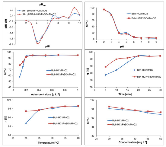 The influence of the initial drug concentration was investigated at 25 °C for 20 min by varying the paracetamol concentration from 30 to 50 mg L−1, while maintaining a constant adsorbent dosage of 0.3 g L−1. The pH of the paracetamol solutions was maintained at 2. The removal efficiency depends on the change in initial concentration, varying, as shown in Figure 7, from 95 to 91% for Bch-HCl/MnO2 and 96 to 93% for Bch-HCl/Fe3O4/MnO2. The decrease in the removal percentage when the drug concentration increases is due to the availability of a smaller quantity of available adsorption sites [48].