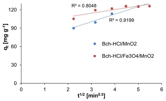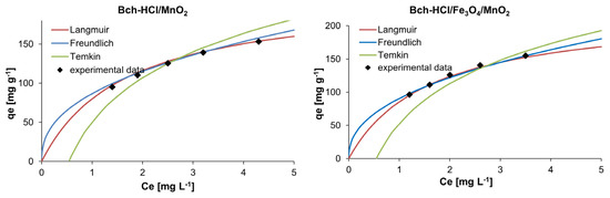 Based on the experiments and calculations performed, the adsorption of paracetamol on Bch-HCl/MnO2 and Bch-HCl/Fe3O4/MnO2 was best described by second-order kinetics. In the case of this model, the highest R2 values were obtained. Nonetheless, fitting the model alone does not conclusively confirm this mechanism [57].