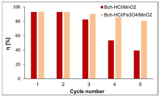 It was observed that the degree of paracetamol removal on the two adsorbents was slightly reduced after each cycle in the case of Bch-HCl/Fe3O4/MnO2, and in the case of Bch-HCl/MnO2, it was significantly reduced after the third cycle. Therefore, the Bch-HCl/Fe3O4/MnO2 composite can be used in a series of treatment cycles.