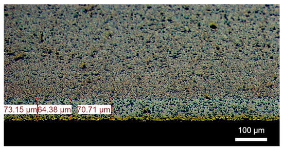 The material used in the study was the AlMn1Cu (EN AW-3003) aluminium alloy, belonging to the group of non-heat-treatable alloys, characterised by an increased manganese content. The surface of the sample was clad on one side with a layer of AlSi7.5 alloy (EN AW-4343), with the aim of improving technological properties, particularly in terms of brazing and oxidation resistance. The chemical composition of the EN AW-3003 core alloy and the EN AW-4343 cladding alloy is presented in Table 1 and Table 2. The content of individual elements complies with the requirements of the EN 573-3:2019 standard [20]. The sheet thickness after plastic deformation was 1.2 mm, while the cladding thickness ranged from 64 to 73 µm, representing approximately 5.33–6.08% of the total strip thickness (Figure 1).