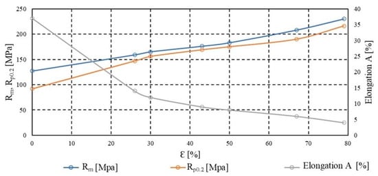 Plastic deformation of metals, which is the permanent change in shape under stresses exceeding the yield strength, is associated with the movement of dislocations within the crystal lattice. As the degree of deformation increases—particularly in processes such as cold rolling—intense dislocation accumulation occurs within the material’s volume. These dislocations interact with one another, forming arrangements that obstruct further dislocation motion, resulting in an increased resistance of the material to deformation. This phenomenon is referred to as strain hardening, or work hardening, which manifests as an increase in strength parameters such as ultimate tensile strength (Rm) and conventional yield strength (Rp0.2), accompanied by a decrease in ductility. The rise in dislocation density primarily occurs along active slip planes and leads to the formation of substructures which, over time, may evolve into subgrain boundaries, initiating recovery and recrystallisation processes during subsequent heat treatment. Figure 2 and Figure 3 present the hardening curves of the material, illustrating changes in the basic mechanical properties–tensile strength, yield strength, and percentage elongation after fracture—as a function of deformation during cold rolling. The analysis was conducted on samples taken both along and across the rolling direction, which enabled the assessment of the influence of rolling orientation on mechanical properties. The initial thickness of the tested material was 6 mm. The rolling process was carried out progressively until a final thickness of 1.2 mm was achieved, corresponding to a 79% reduction in cross-sectional area. This reduction results in a true strain of approximately 1.609. In this condition, the material was subsequently subjected to annealing. With increasing deformation, a systematic rise in strength parameters was observed, accompanied by a decrease in elongation, which is characteristic of the strain hardening effect. The differences between the directions of testing also provided insight into the impact of structural anisotropy developed during the deformation process.