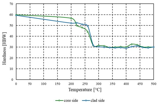 - For the core layer, hardness dropped from 59.8 HBW to 29.7 HBW at 340 °C, and for the clad side from 59.3 HBW to 29.0 HBW at 400 °C. Above the recrystallisation temperature, the hardness stabilised within the range of 29.0–31.1 HBW.