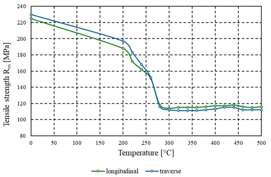 - Tensile strength tested both in the longitudinal and transverse directions relative to the rolling direction systematically decreased with increasing soaking temperature from 225 MPa to 114 MPa (longitudinal) and from 230 MPa to 111 MPa (transverse). The conventional yield strength (Rp0.2) for both longitudinal and transverse samples decreased from initial values of 207 MPa (longitudinal) and 216 MPa (transverse) to 41 MPa.