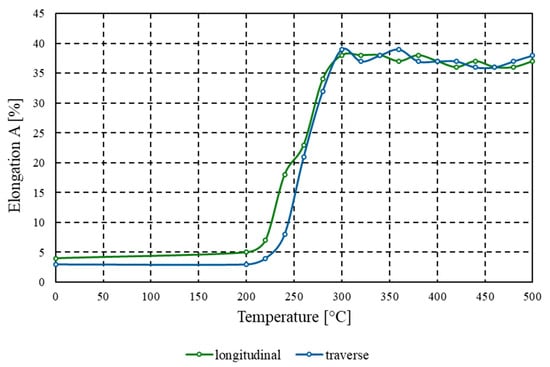 In contrast to the behaviour of tensile strength and conventional yield strength, the percentage elongation after fracture A increased with rising annealing temperature (Figure 7). For samples tested in both the longitudinal and transverse directions relative to the rolling direction, the elongation prior to heat treatment was 4% and 3%, respectively. With increasing annealing temperature, the elongation value A rose nearly ninefold for the material annealed at 300 °C, reaching 39% and 38%, respectively. Further increases in the heat treatment temperature led to a stabilisation of the curve, with the measured values falling within the range of 36–39%.