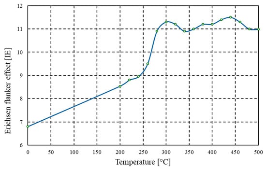 The results of the Erichsen formability test clearly indicate a significant influence of heat treatment temperature on the plastic deformability of the tested alloy (Figure 8). In the initial state, i.e., immediately after rolling, the punch penetration depth was 6.8 mm. This value is typical for strain-hardened materials, which exhibit increased hardness and residual internal stresses that limit the material’s ability to undergo local deformation under tensile loading conditions, as represented in the Erichsen test. For samples annealed at lower temperatures, i.e., within the range of 200–260 °C, the punch penetration depth ranged between 8.8 and 9.5 mm. These minor changes compared to the initial state suggest that full recrystallisation had not yet occurred within this temperature range. It may be assumed that only partial relaxation of internal stresses took place at this stage of the process, resulting in a slight improvement in deformability. It is also worth noting that the persistently high hardness of the material within this temperature range correlates with the limited increase in formability, which further confirms the strong dependence of deep drawability on the degree of microstructural softening achieved through annealing.
