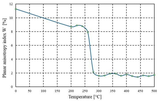 In the tested alloy, the planar anisotropy index (W) in the initial state was 11.27%, indicating a strong rolling texture and a variation in plastic properties depending on the sample orientation relative to the rolling direction (Figure 9). This level of anisotropy is typical for materials that have been heavily cold rolled, in which grains are significantly flattened and the crystallographic arrangement is aligned along a single preferred direction. As the annealing temperature increased, a clear downward trend in the W value was observed. Initially, at temperatures between 200–260 °C, the anisotropy value decreased only slightly, reaching levels of 8.7–7.9%. It may be assumed that within this temperature range, only partial stress relaxation and limited substructural transformations occurred, which is insufficient, however, for a significant reconfiguration of the texture. The recrystallisation process responsible for microstructural homogenisation and the elimination of directional orientation effects had not yet become fully active. It was only in the temperature range of 300–400 °C that a significant reduction in the anisotropy index was recorded–from the initial 11.27% to values below 2.0%–clearly indicating the occurrence of full recrystallisation and the formation of new grains with random crystallographic orientation. This process leads to a substantial reduction in the directionality of mechanical properties, which is particularly desirable in applications requiring deep drawing, especially in the production of thin-walled heat exchangers, technical packaging, or profiled components. The lowest W index values–below 1.71%–were recorded after annealing at temperatures between 420–500 °C, indicating the achievement of a nearly isotropic microstructure in the sheet plane. Such a material state enables more predictable forming of geometrically complex shapes, reduces the risk of local cracking and distortion, and minimises the need for adjustments to forming tools.