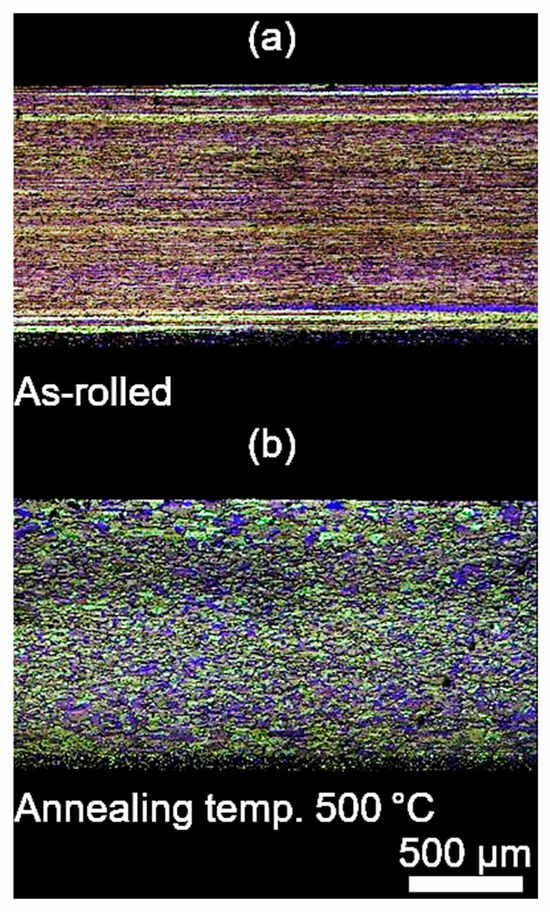 It should be noted, however, that as in other studies on low-alloy cold-rolled sheet, the course of recrystallisation may vary depending on the degree of deformation. In the case of samples with a low degree of strain (ε < 0.9), there is a risk that even after annealing at high temperatures (up to 500 °C), only the surface layer of the material will be transformed, through grain boundary growth rather than the true recrystallisation mechanism. In such cases, the bulk of the sample may retain characteristics of a cast or deformed structure, as confirmed by both cross-sectional observations and local hardness measurements. This phenomenon was not observed in the present study, which suggests that the level of deformation was sufficient to activate full recrystallisation both at the surface and within the bulk of the material. Nonetheless, this factor should be taken into account when planning industrial annealing of thin aluminium strip (particularly in cases of low strain) where full microstructural uniformity may not be achieved through heat treatment alone [17].