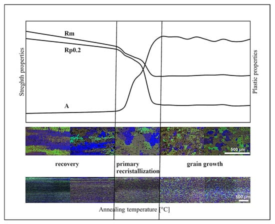 - Above the recrystallisation temperature (340 °C), further changes were minor, with tensile strength remaining within the range of 115–118 MPa and yield strength (Rp0.2) within the range of 41–44 MPa.