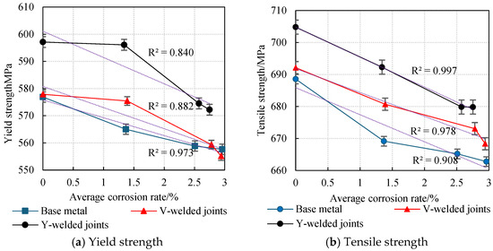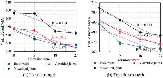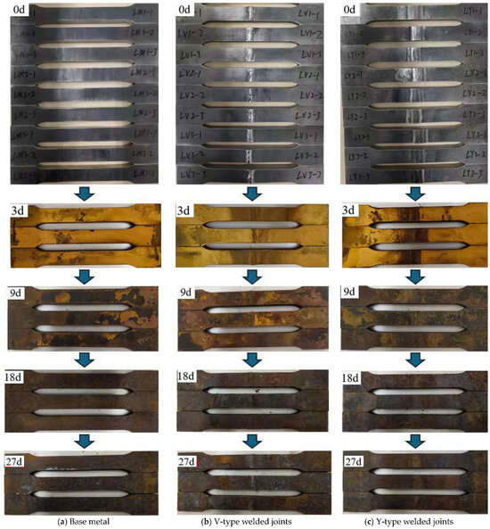 - With prolonged corrosion exposure, all weathering steel specimens exhibited a progressive degradation in yield strength, yield load, tensile strength, and ultimate load, with gradually decreasing degradation rates. After 27 days of corrosion, the base metal specimens, V-type, and Y-type welded joint specimens showed yield strength reductions of 3.33%, 3.93%, and 4.17%, respectively. The material inhomogeneity in weld zones was found to adversely affect the corrosion resistance of weathering steel specimens. However, due to the presence of the weld metal alloy, the welded joint specimens exhibit higher strength than the base metal specimens.