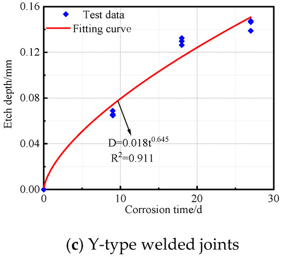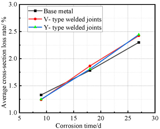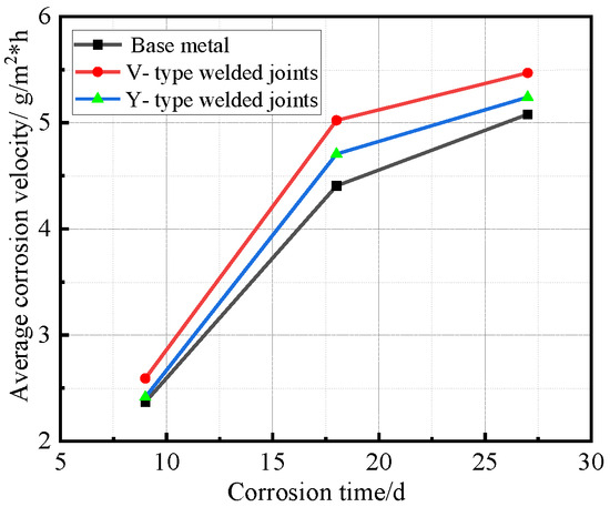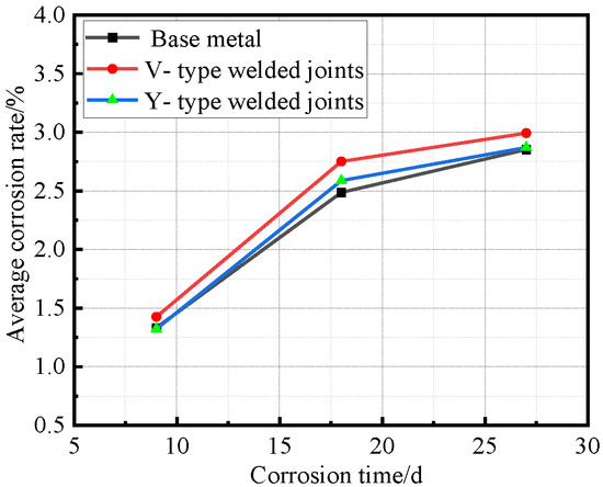- The corrosion process can be divided into two distinct stages: a rapid corrosion stage (before 18 days), and a slow corrosion stage (after 18 days). For both types of welded joint specimens, the corrosion rates were consistently higher than those of the base metal specimens under identical corrosion durations. Moreover, the difference in corrosion rates between the base metal and welded joint specimens initially increased, subsequently decreased, and eventually stabilized over time.